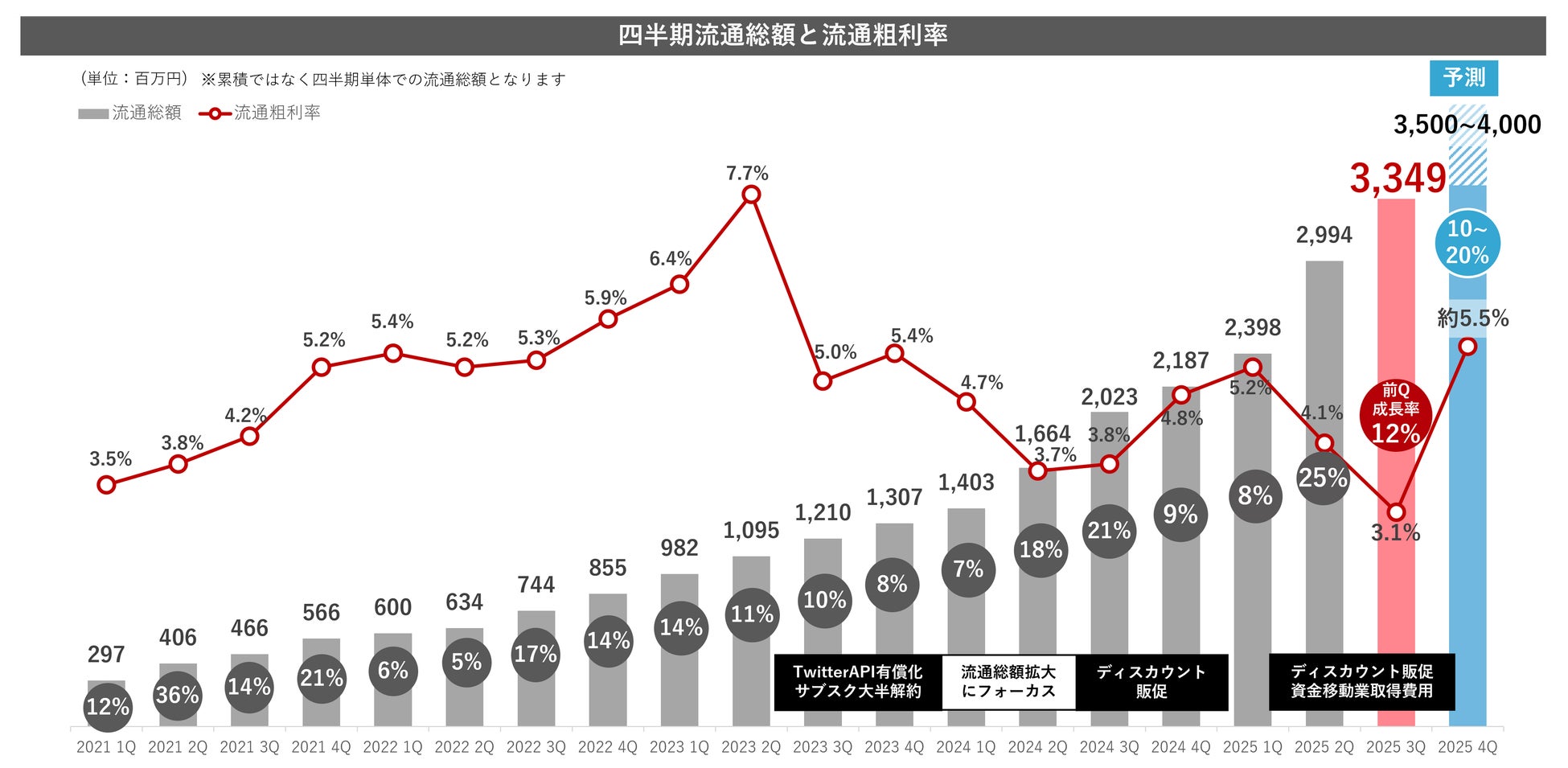 2025年9月期第3四半期においては前四半期対比112%、流通総額約34億円へ到達いたしました。流通総額1,000億達成に向けて、「3万円以下のto C現金支払い」を、①広告領域 ②人材領域 ③金融領域の3軸にて網羅を目指してまいります。各領域における取り組みを強化し、2027年9月期に掲げている流通総額1,000億円を達成することで、圧倒的低手数料を実現し、より多くの企業様にご利用いただけるよう、更に邁進してまいります。