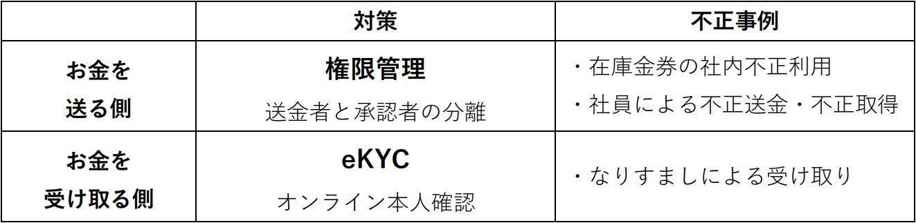 当社は、お金を送る側・受け取る側への不正対策として、権限管理、eKYCを提供しています。