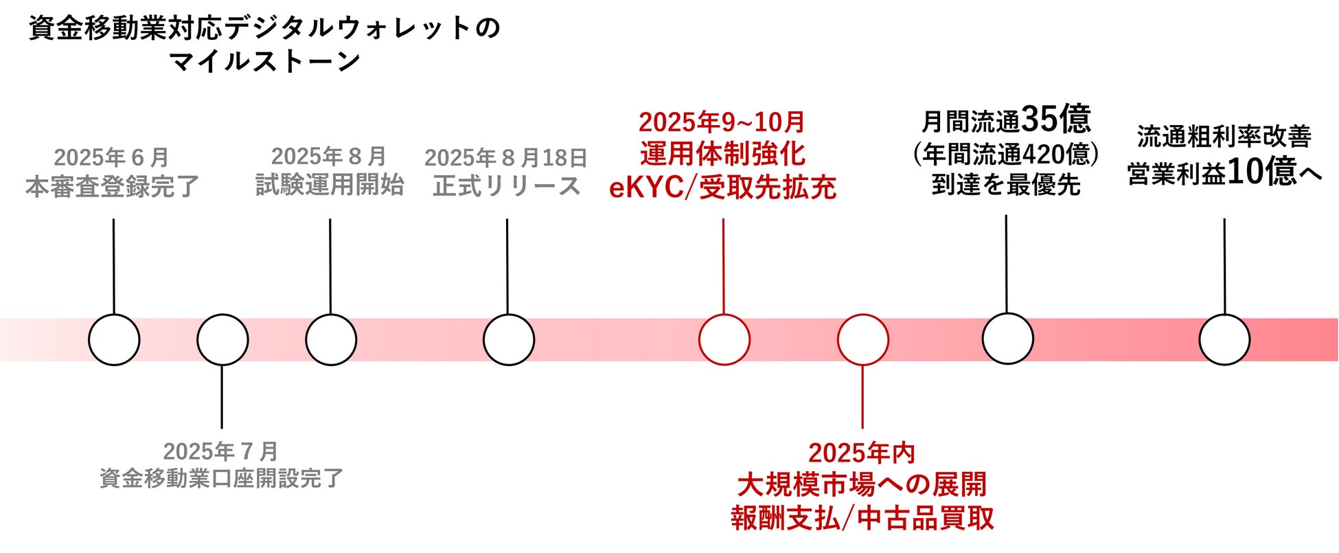 まずはこの「月間流通35億円」のベースを固めることを最重要課題と位置づけ、流通拡大を最優先に取り組んでまいります。デジタルウォレットの立ち上げフェーズにおいては流通粗利率よりも流通規模の拡大を重視した事業運営を進めてまいります。その後、月間流通35億円到達後のフェーズで、利益率の改善を段階的に進めていくことで、年間営業利益10億円を目指します。