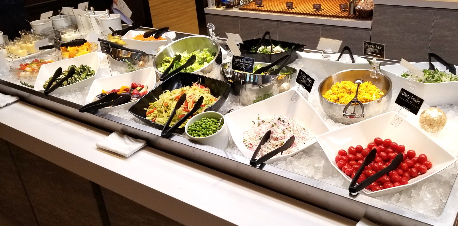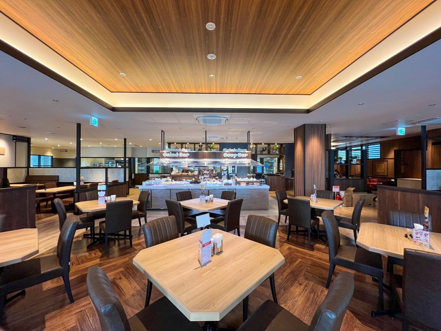 店内には計132席(34卓)ご用意し、なかには少人数での記念日やパーティーに最適なシックな内装の特別スペースも設置しております。また、店内装飾だけでなくフォルクスの特徴であるサラダバーも一新しており、見た目も華やかなアイランド型で展開し、京水菜や泉州産たまねぎなど関西にゆかりのある食材や自家製のスイーツ、ドレッシングを導入しグレードアップいたしました。