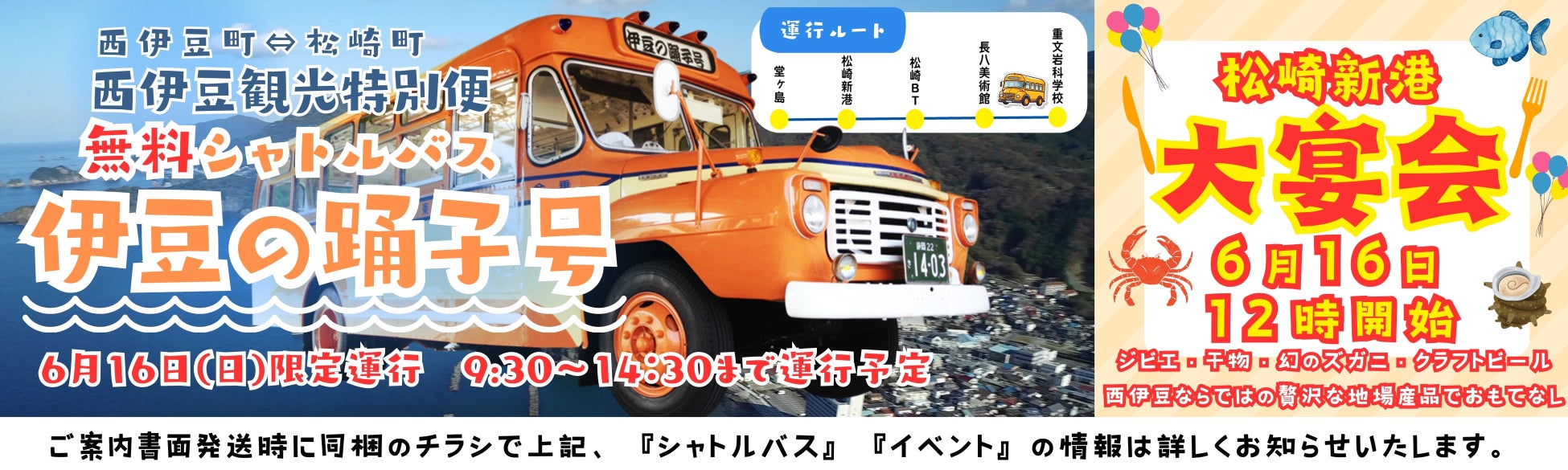 東京発は4月25日(木)より受付開始で、下船後の宿泊施設や移動手段はお客様ご自身の手配となります。又、おもてなしの一環として松崎町と西伊豆町の観光協会が中心となり、6月16日(日)限定で松崎新港と地域の観光名所を巡る無料シャトルバスの運行、地域の名産品を取り扱う物販店や飲食店が集う「大宴会」を12時~16時で開催いたします。