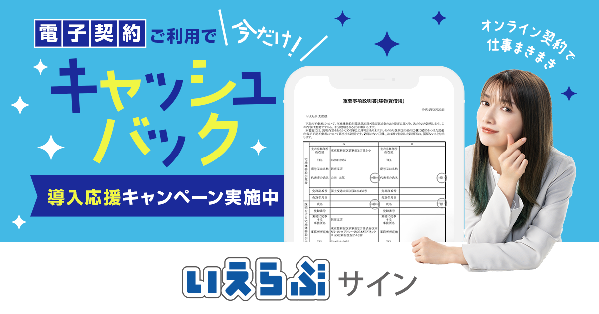 5月18日、改正宅建業法の施行により不動産取引における電子契約の利用が全面解禁となりました。これを受け、不動産業務支援に特化したバーティカルSaaSを提供する株式会社いえらぶGROUP(本社:東京都新宿区、代表:岩名泰介、以下「いえらぶGROUP」)は、不動産に特化した電子契約システム「いえらぶサイン」の導入キャンペーンの延長を決定しました。不動産業界の電子契約利用を推進し、不動産事業者の業務効率化と顧客満足度の向上に貢献します。