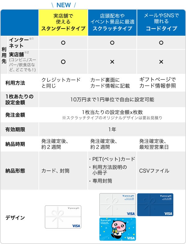 個人向けのVプリカリアル同様に、受け取った方はクレジットカードと同じようにVisa加盟店の実店舗で利用ができるVisaギフトカードです。キャンペーンなどの各種インセンティブとして、今後は全3タイプで取り扱いを行ってまいります。