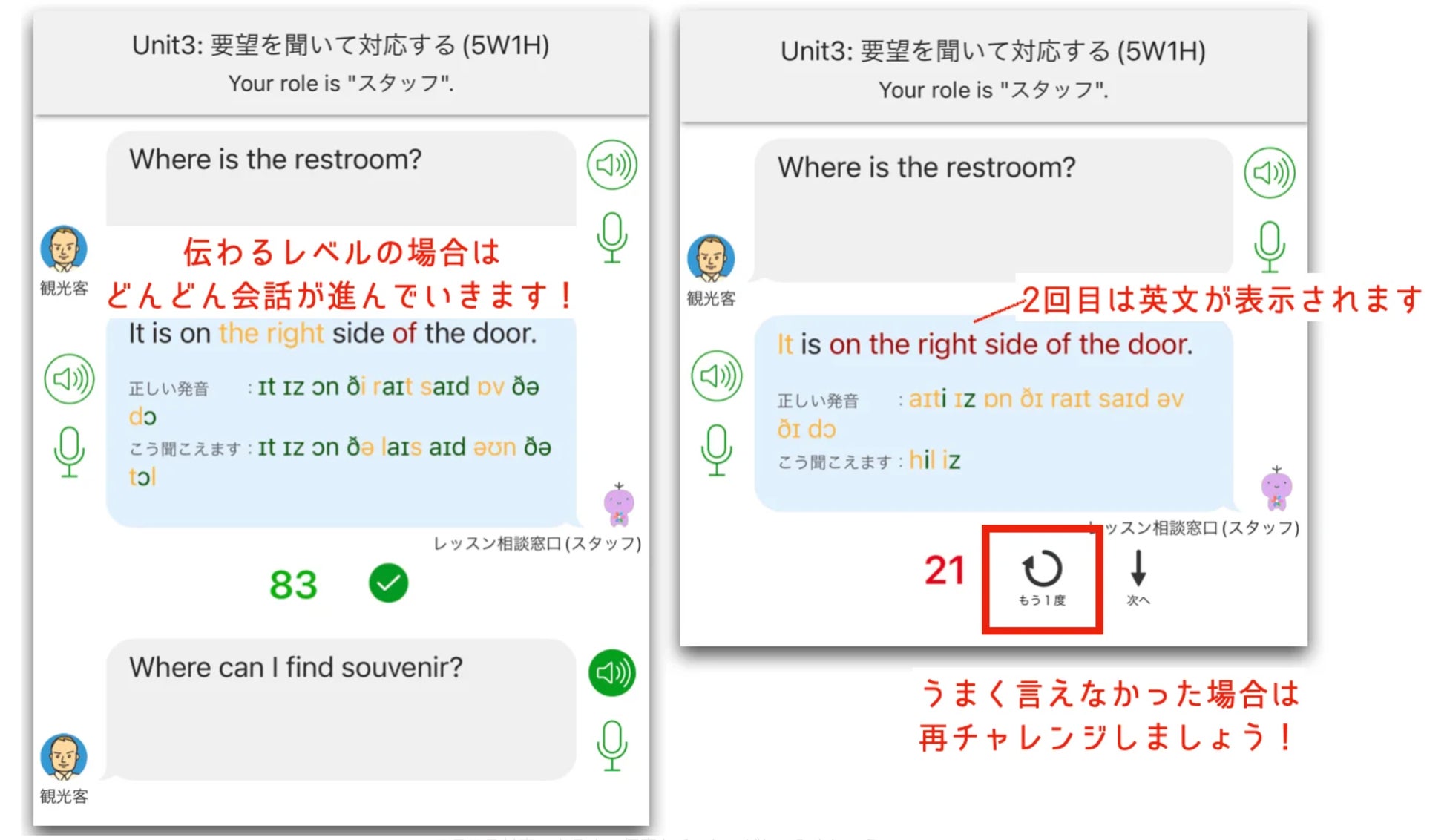 音声を声に出すと発音がチェックされ、伝わるレベルであれば会話がどんどん進んでいきます。発音が間違っていたり発言できなかったりすると、ストップして英訳が表示されるので、伝わるレベルになるまで再チャレンジしてください。どうしても進めない場合は「次へ」を押して先へ進めます。