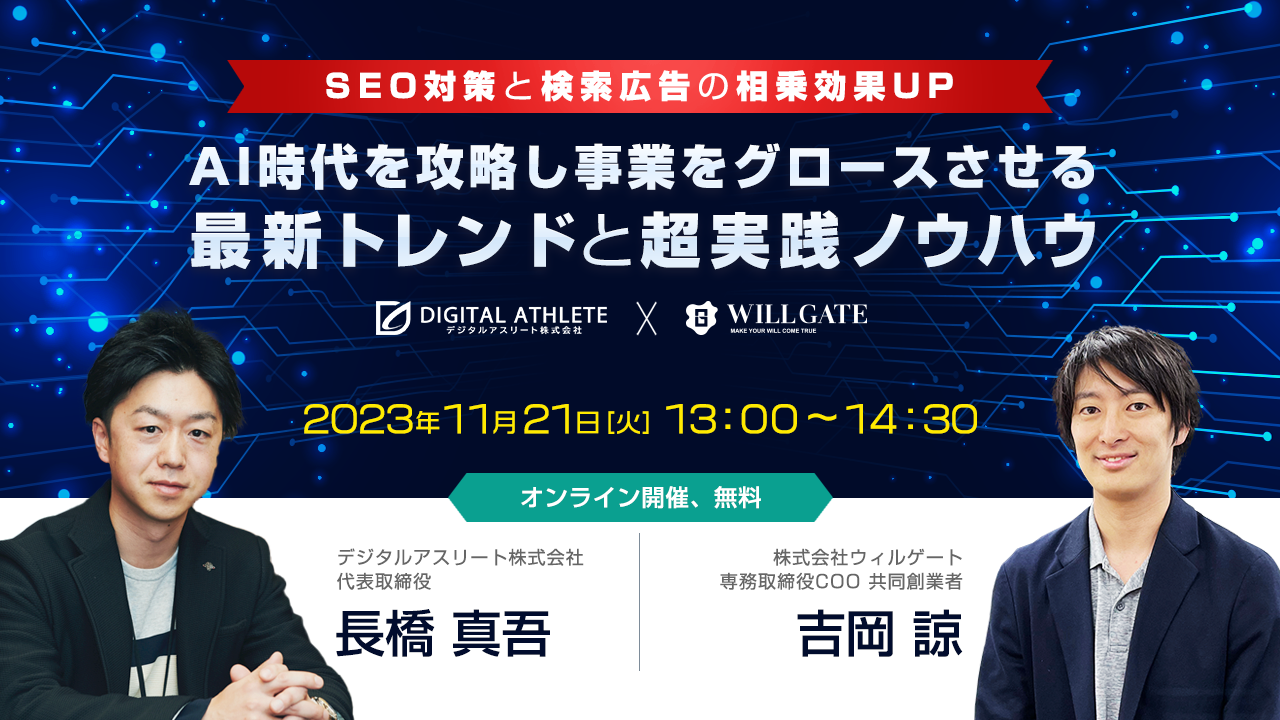 ウィルゲート、11月21日にデジタルアスリート社と《【SEO対策と検索広告の相乗効果UP】AI時代を攻略し事業をグロースさせる最新トレンドと超実践ノウハウ》をテーマにオンラインセミナーを開催