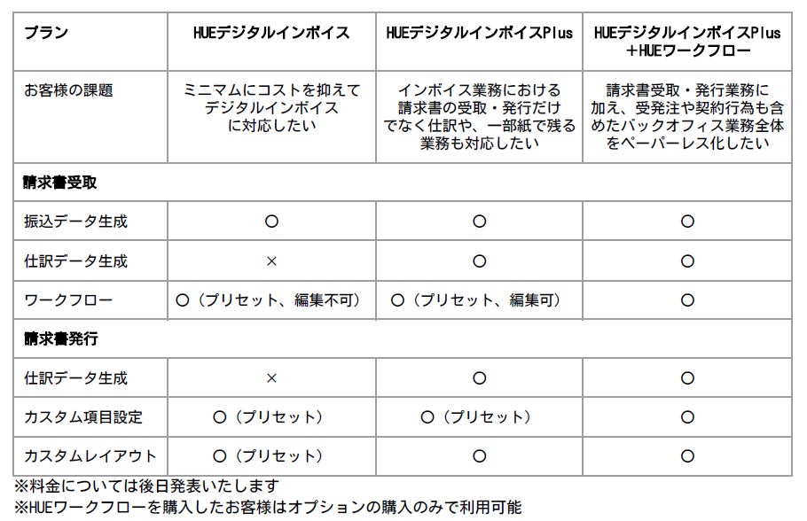 「HUEデジタルインボイス」は、デジタルインボイスの送受信を手ごろに簡単に実現するサービスです。会計システムを導入していない企業はもちろん、導入済みの企業でも現行システムを継続しながら、最小限のコストで、デジタルインボイスの送受信に対応することが可能です。また、「デジタルインボイスPlus」として、デジタルインボイスに限らず、紙を含めた請求書関連業務を幅広くカバーしたラインナップも投入します。メール・紙の請求書の送受信から消込等の業務まで対応が可能です。