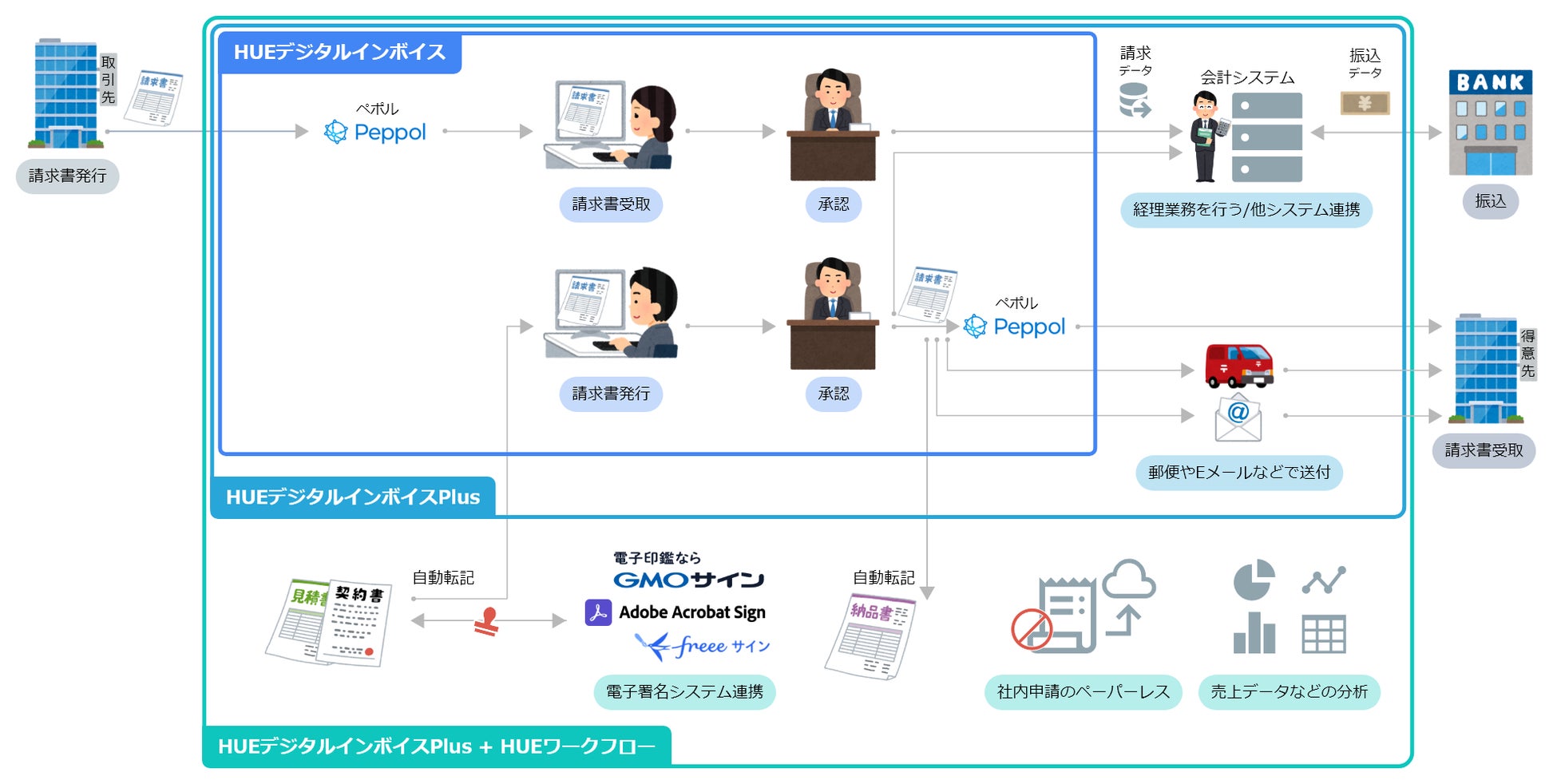 中堅中小も電子インボイス導入しやすく、既存システムとも連携可能。クラウド請求書送受信サービス「HUEデジタルインボイス」