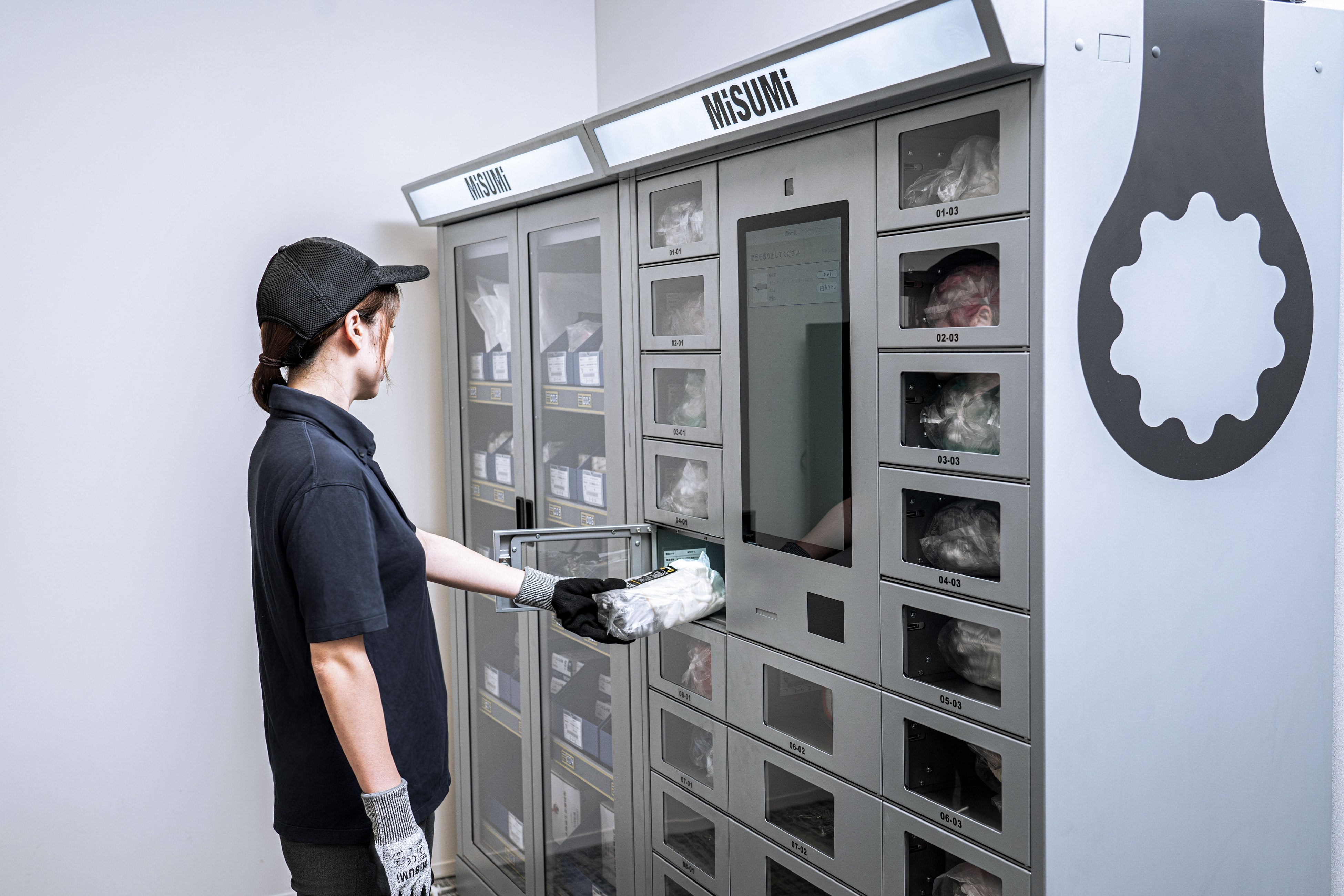 お客さまが高頻度で使用する消耗品は工場常設の自販機まで納品を行い、自販機内の在庫はミスミ資産となるので過剰在庫を抱えることはありません。さらに、自販機から取り出す際は顔認証やIDパスが必要になるため、使い過ぎを防ぎ、社員のコストに対する意識改革にもつながります。