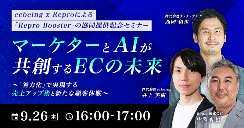 マーケティングソリューションの提供によりWebとアプリの収益最大化を支援するRepro株式会社は、2024年9月26日(水)に株式会社チュチュアンナでAIモデルを活用するなど先進的な取り組みをする西岡氏、数々のECサイト支援実績をもつecbeing 井上氏をお招きし、事業会社でECサイトの立ち上げ・運営経験も持つRepro 中澤と共にAI時代にマーケターが取り組むべき顧客体験と、売上を向上するための「省力化」について語り合います。