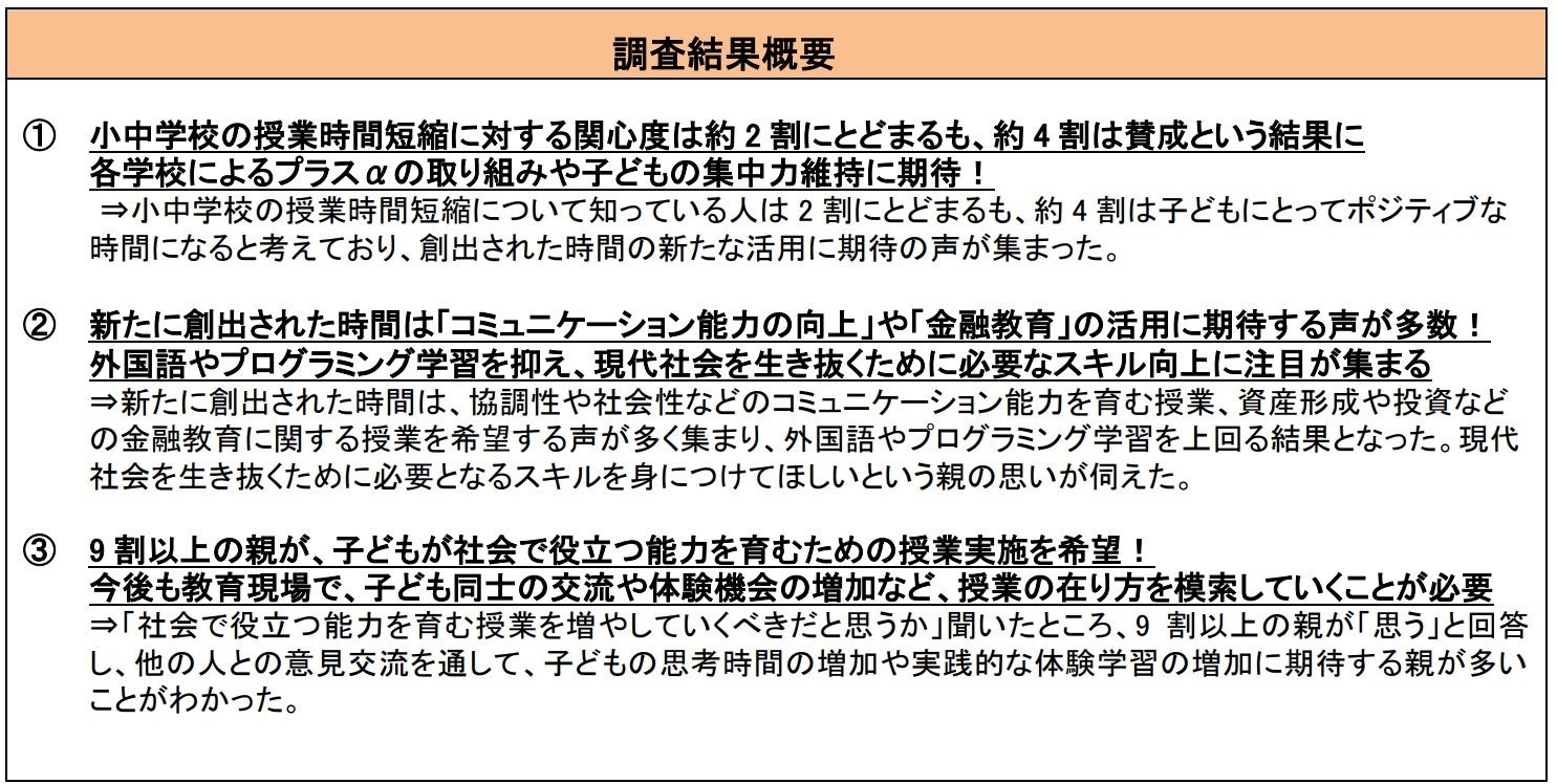 調査の結果、小中学校の授業時間短縮への関心度は約2割にとどまるものの、新たに創出された時間を使い、各学校でプラスαの取り組みを行う事に期待していることがわかりました。さらに、親の関心として、コミュニケーション能力の向上や金融教育など、基礎学力学習に留まらず、子ども同士の交流や体験を通して、社会で役立つ力を身につけてほしいと考えていることが明らかとなりました。