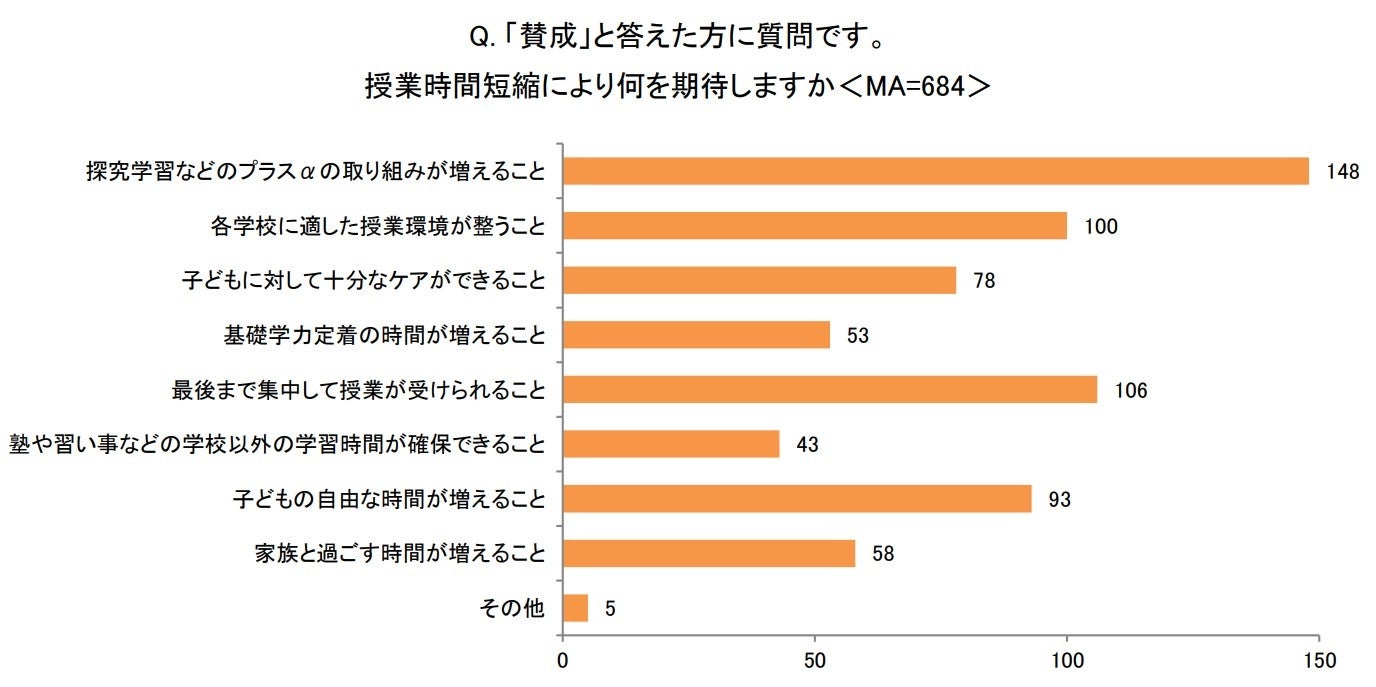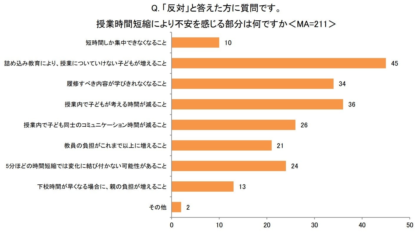 さらに「文部科学省の方針についてどう思いますか<SA>」と伺ったところ、約4割が「賛成」と回答し、「探究学習などのプラスαの取り組みが増えること」(148)や「最後まで集中して授業が受けられること」(106)、「各学校に適した授業環境が整うこと」(100)に期待していることがわかりました。一方で、約1割の「反対」と回答した人に「授業時間短縮により不安を感じる部分は何ですか<MA>」と聞くと、「詰め込み教育により、授業についていけない子どもが増えること」(45)に最も回答が集まりました。授業時間の短縮により新たに創出された時間が、子どもにとってポジティブな影響があると考える親が多い一方で、授業内容のボリューム増加やスピード感に不安を感じていることが伺えます。