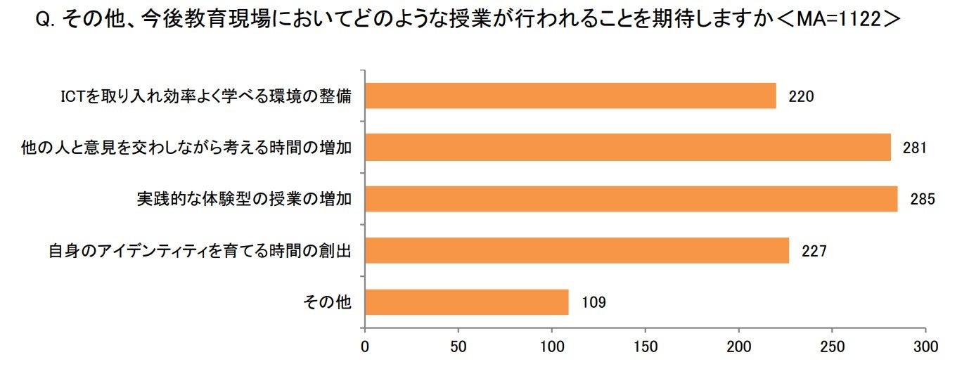 「社会で役立つ能力を育む授業を増やしていくべきだと思いますか<SA>」と聞いたところ、9割以上の親が「思う」(479)と答えました。「その他、今後教育現場においてどのような授業が行われることを期待しますか<MA>」では、「実践的な体験型の授業の増加」(285)が最も多く、次いで「他の人と意見を交わしながら考える時間の増加」(281)となりました。この結果から、前問のコミュニケーション能力向上と同様、他の人との意見交流を通して子どもの思考時間の増加や実践的な体験学習の増加に期待する親が多いことがわかりました。