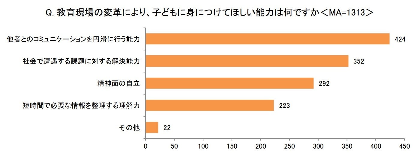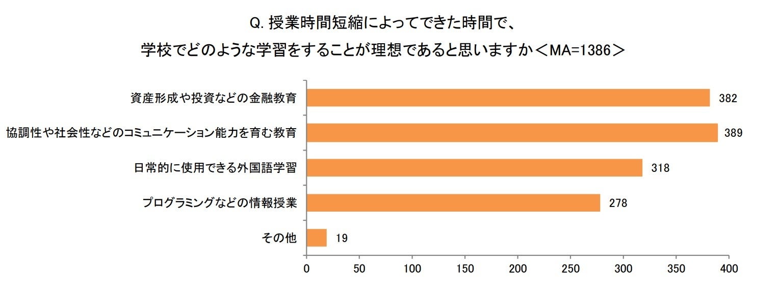 「授業時間短縮によってできた時間で、学校でどのような学習をすることが理想であると思いますか<MA>」では、「協調性や社会性などのコミュニケーション能力を育む教育」(389)と「資産形成や投資などの金融教育」(382)があげられました。さらに、「教育現場の変革により、子どもに身につけてほしい能力は何ですか<MA>」と伺ったところ、「他者とのコミュニケーションを円滑に行う能力」(424)が選ばれました。外国語やプログラミング学習以上に、子どものコミュニケーション能力の向上や金融教育に力を入れてほしいと考えていることがわかります。