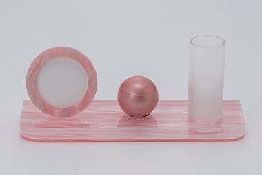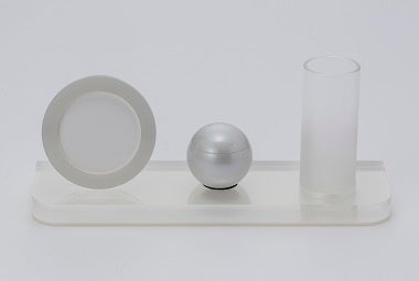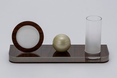 「Parfe」は、アクリル・金属(真鍮)・ガラスを組合せたオールインワンタイプです。プチポット(骨壺)と一緒に、花立やフォトフレームなどを別途揃えるお客様が多くいらっしゃる為、今回、省スペースで設置できるアクリル素材のステージに、同素材のミニ写真立、ガラス製の花立をすべてセットにした商品を開発、導入致しました。