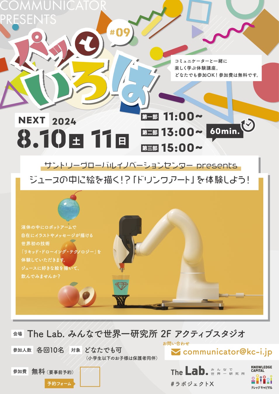 液体の中に自在にイラストやメッセージを描くことができる世界初のフード3Dプリンター技術を使った「パッといろは #9サントリーグローバルイノベーションセンター presents ジュースの中に絵を描く!?『ドリンクアート』を体験しよう!」は、開発元のサントリーグローバルイノベーションセンターとコラボレーションした特別企画で、世界で初となるワークショップとして8月10日(土)・11日(日)に各3回開催します。