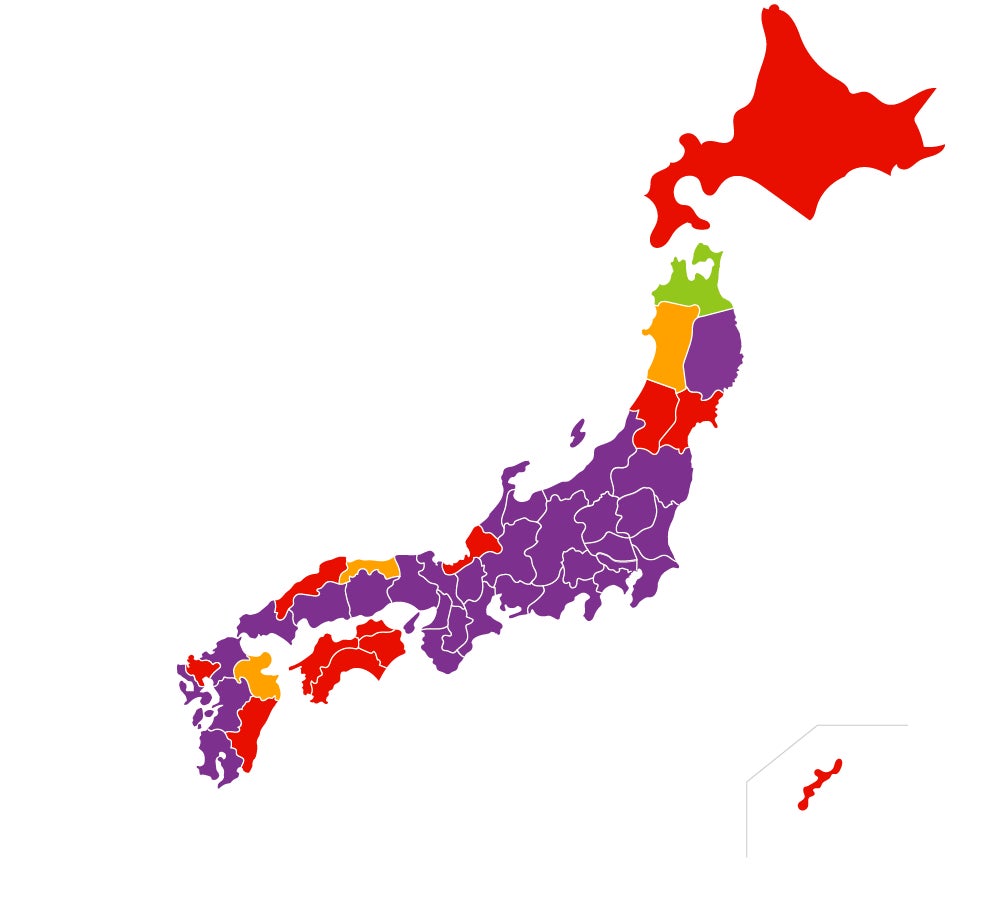 『ハチ発生指数』では、ハチの発生レベルを4段階に分けて都道府県ごとに色付けしています。