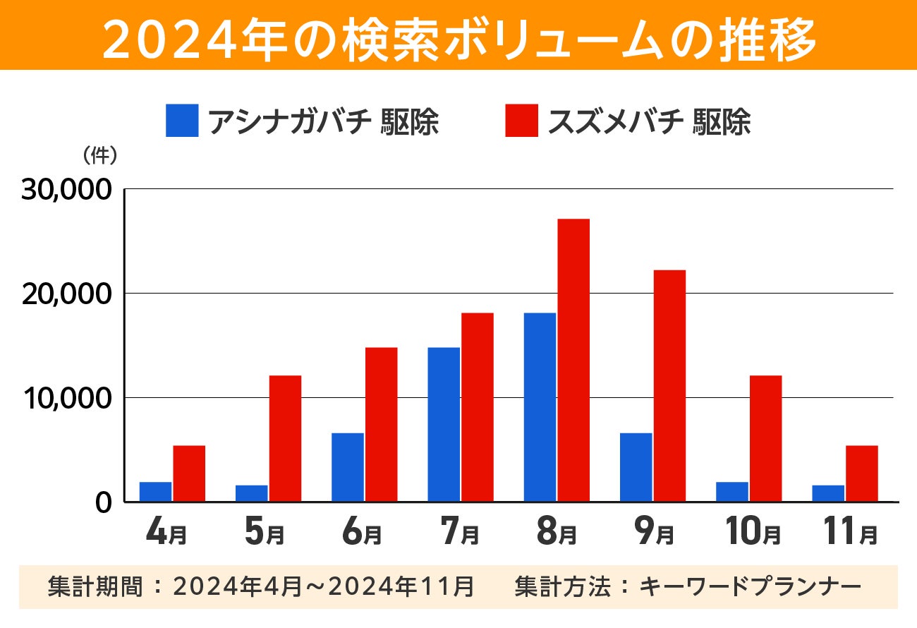 さらに10月時点でも10,000を超えることから、秋に入ってもスズメバチの駆除を検討している方が多いことがわかります。