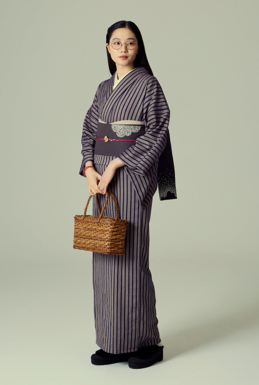 経糸と緯糸の絡みを変えることで生まれる「シボ」が特徴のしじら織り。ハンサムなストライプのラインが印象的なきものに、ベージュの小物で秋らしい雰囲気に。
