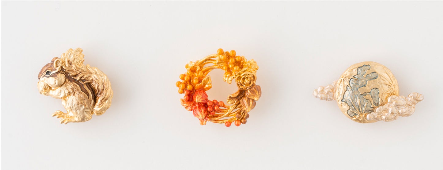 秋らしいモチーフで遊び心をプラスする帯留。木の実を口いっぱいにほおばるリス、季節の移ろいを感じる木の葉、まろやかな輝きをたたえた中秋の名月など、小さなアクセントで装いに彩りを。