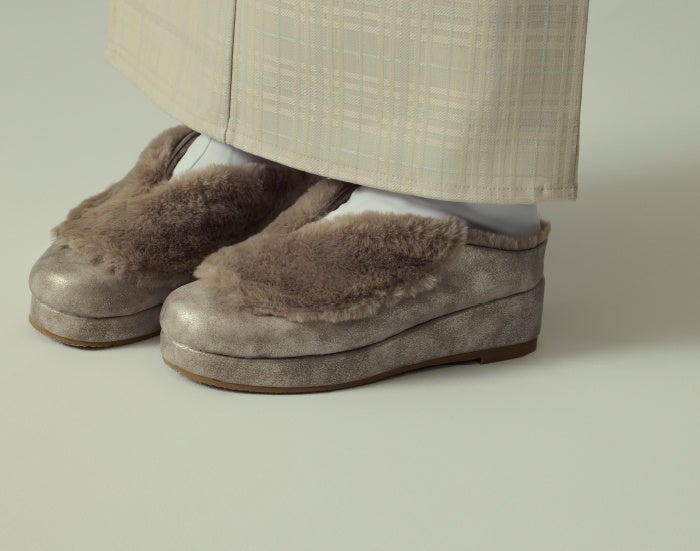 きものに合わせて履きやすい仕様とデザインで、冬の着姿をあたたかく彩ります。鼻緒がなく靴下でも着用可能。底には凍結路面でも滑りにくいガラス繊維配合の防滑底を採用しています。
