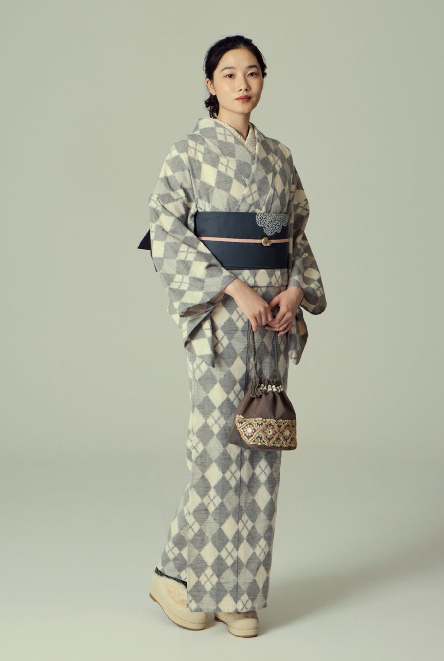 大胆なアーガイルチェックはワンピース感覚で。刺繍の半巾帯で気軽な着こなしを。
