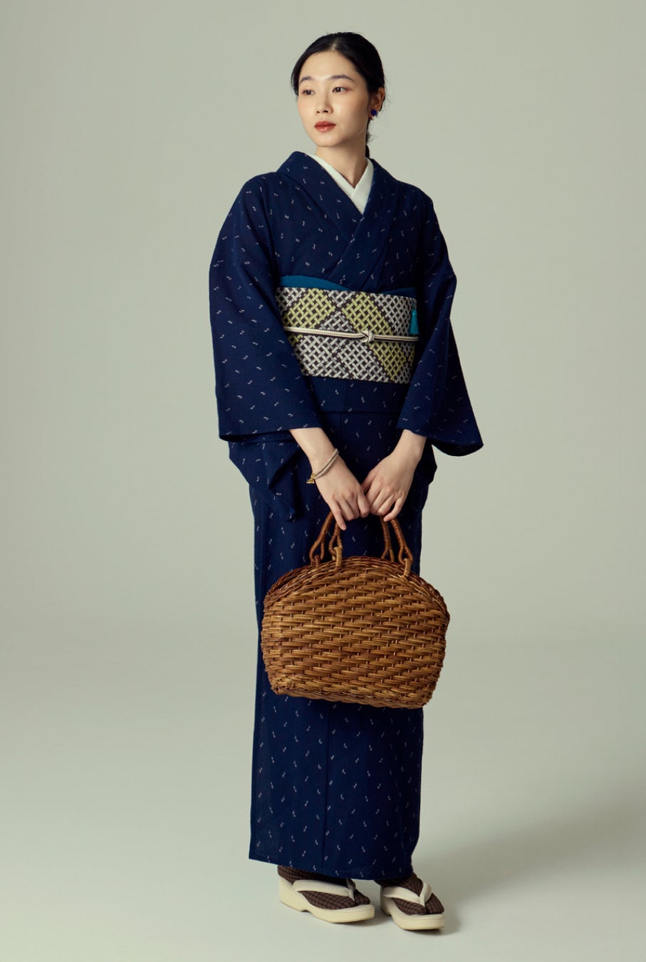 規則的なリズムある絣模様で、軽やかな印象に。帯周りのブルーの小物がアクセント。