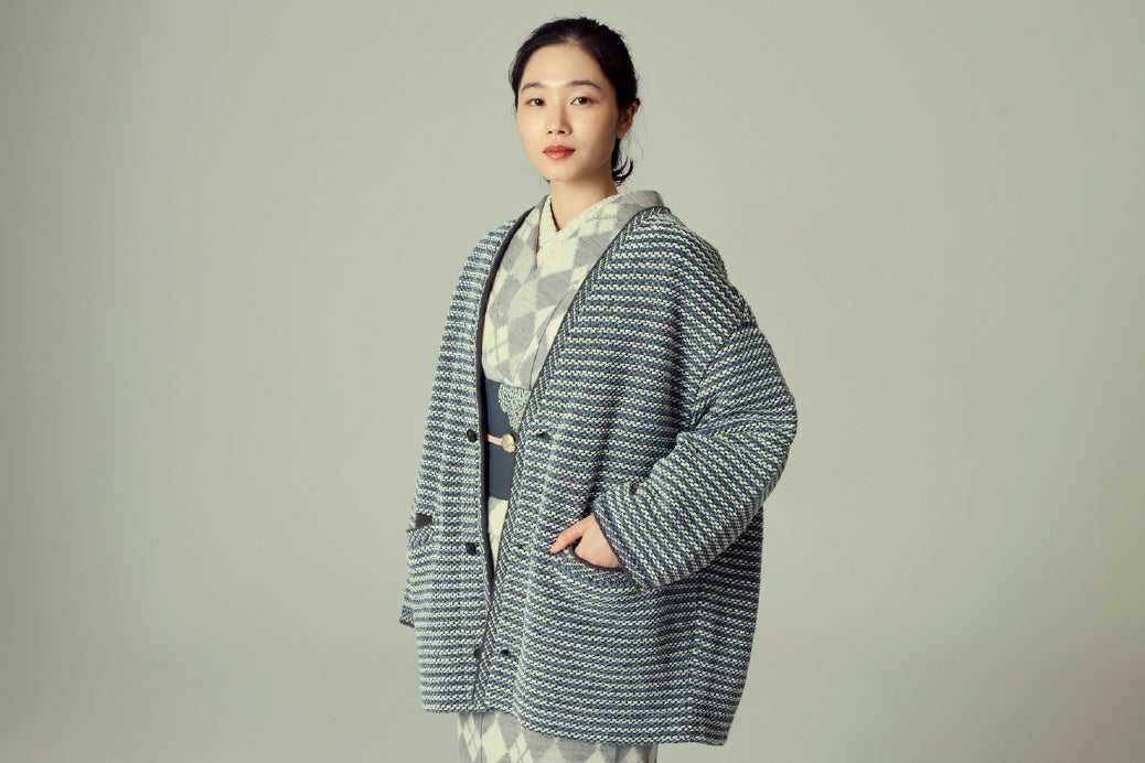 山形・米富繊維と製作したコーディガン。モール糸特有の上品なツヤと立体感が、シンプルな装いに映え、きものにも洋服にも合わせやすい一枚。軽やかで、リラックス感のある着心地が魅力です。