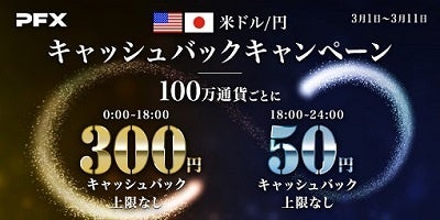 株式会社 マネーパートナーズ(代表取締役社長:福島秀治、本社:東京都港区、以下「当社」)では、3月1日より『パートナーズFX』で、3月の高額キャッシュバック キャンペーンを実施しております。対象は、パートナーズFX「米ドル/円」と「トルコリラ/円」です。特に「米ドル/円」はキャッシュバック対象時間が拡大となり、24時間キャッシュバックの対象へパワーアップしました。