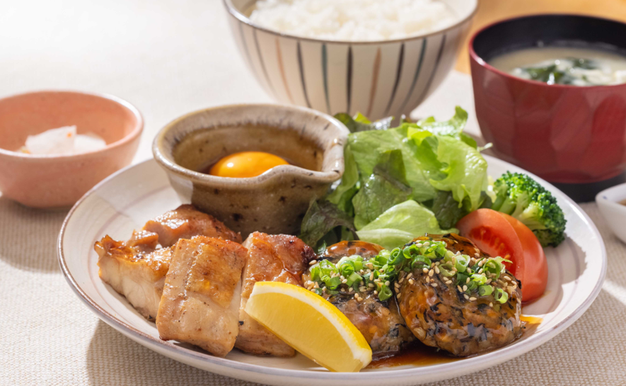 脂がのったさばを、じっくり炭⽕で焼き上げました。すりたての⼤根おろしと相性抜群! ヘルシーで⾻も少なく⾷べやすい、健康志向の⼈やダイエット中の⼥性にも嬉しいメニューです。