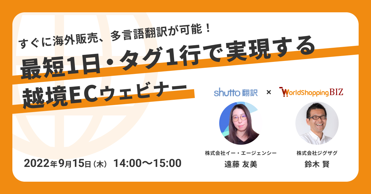 株式会社ジグザグ(本社:東京都渋谷区、代表取締役:仲里一義)は、Webサイト翻訳サービス「shutto翻訳(しゅっと ほんやく)」を提供する株式会社イー・エージェンシー(本社:東京都千代田区、代表取締役:甲斐真樹)と、2022年9月15日(木)にオンラインセミナー『ECサイトの海外販売、多言語翻訳を最短1日・タグ1行で実現する越境ECウェビナー』を開催いたします。