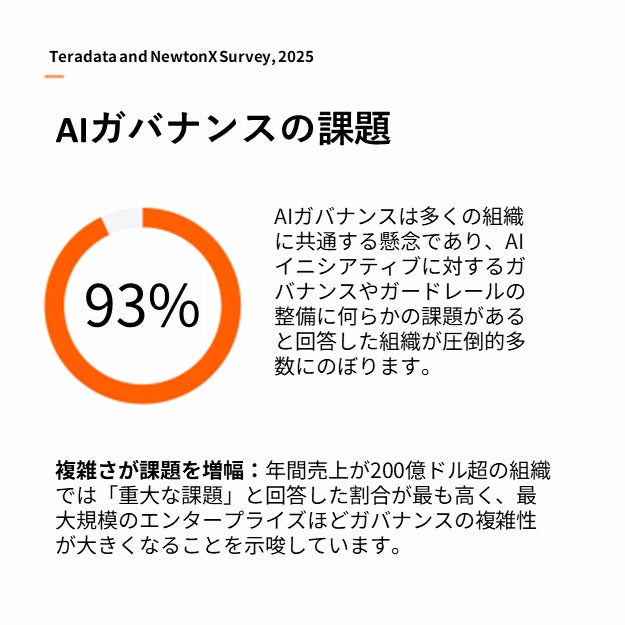 93%がAIガバナンスに課題を抱え、年商200億ドル超の企業では42%が「重大な課題」と回答。データの正確性(34%)がセキュリティ(32%)をわずかに上回り最大の懸念となっています。適切なデータを迅速かつ一貫して提供できると回答した企業は4%にとどまり、96%が遅延や不整合を経験。また、AIイニシアティブ推進に必要スキルをすでに保有している企業は13%のみで、社内教育や外部人材活用によるスキル獲得が急務となっています。