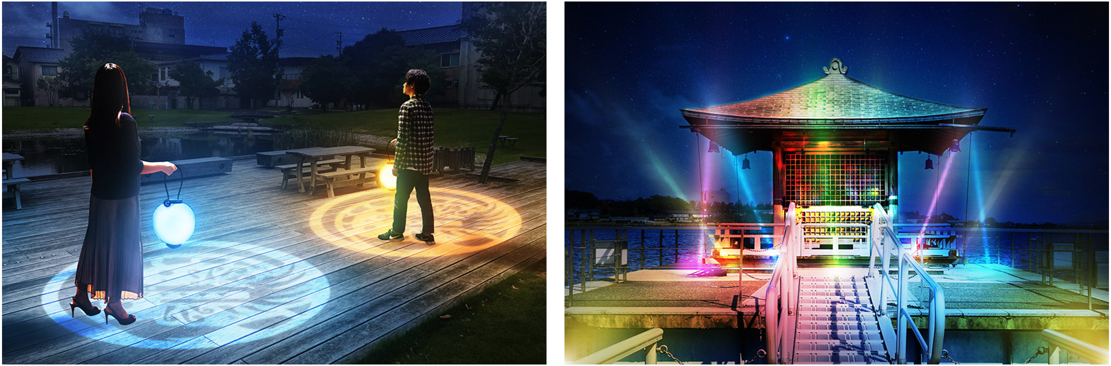 右:柴山潟をバックにライトアップされた浮御堂。NAKEDディスタンス提灯®をかざすことで現れるのは・・・?