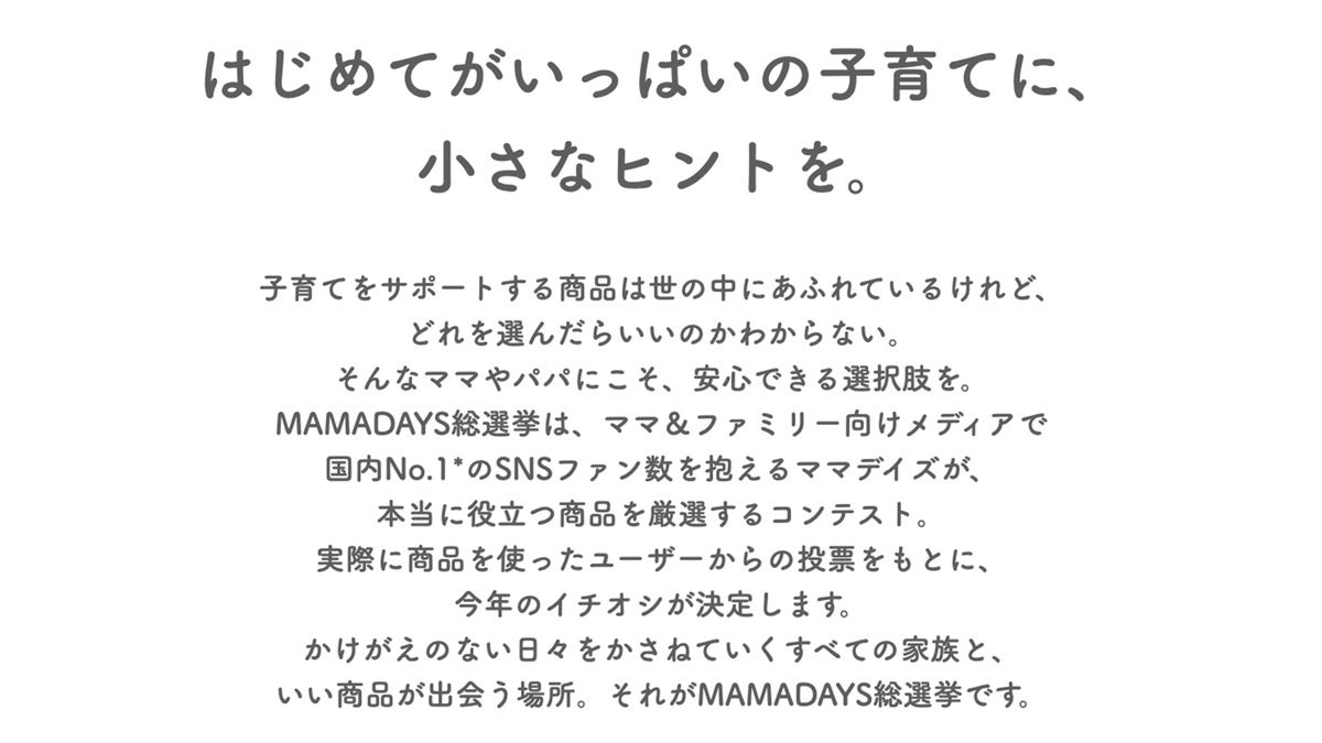そこで、全国にいる『MAMADAYS』ユーザーの投票によって選ばれた「使って良かった」「これからも使い続けたい」という商品・サービスを紹介する「MAMADAYS総選挙」を今年も開催します。SNSファン数 国内No.1※の『MAMADAYS』がユーザーの投票によって選ばれた商品・サービスを紹介する「MAMADAYS総選挙」を開催することで、新しい商品との出会いの機会を創り出すことができると考えています。
