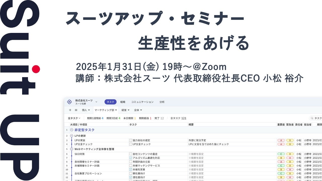 株式会社スーツ(所在地:東京都千代田区、代表取締役社長CEO:小松 裕介)は、2025年1月31日(金)19時から、当社代表の小松が講師を務めるスーツアップ・セミナー「生産性をあげる」を無料開催します。