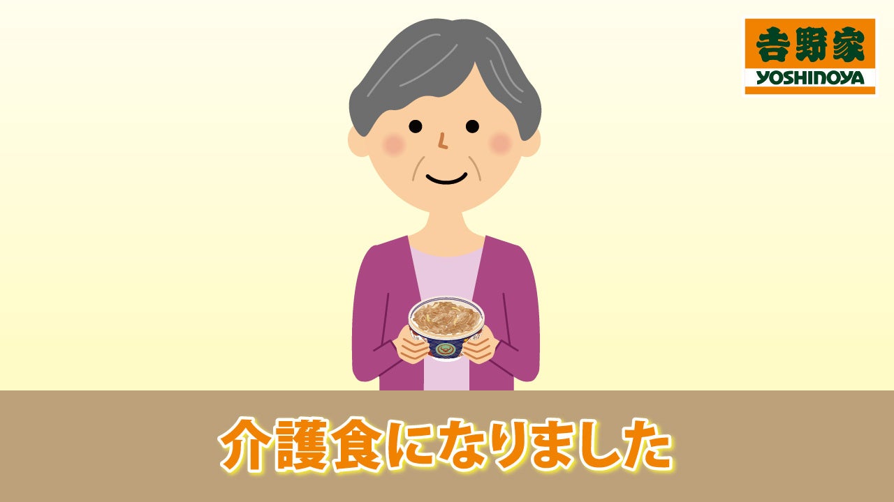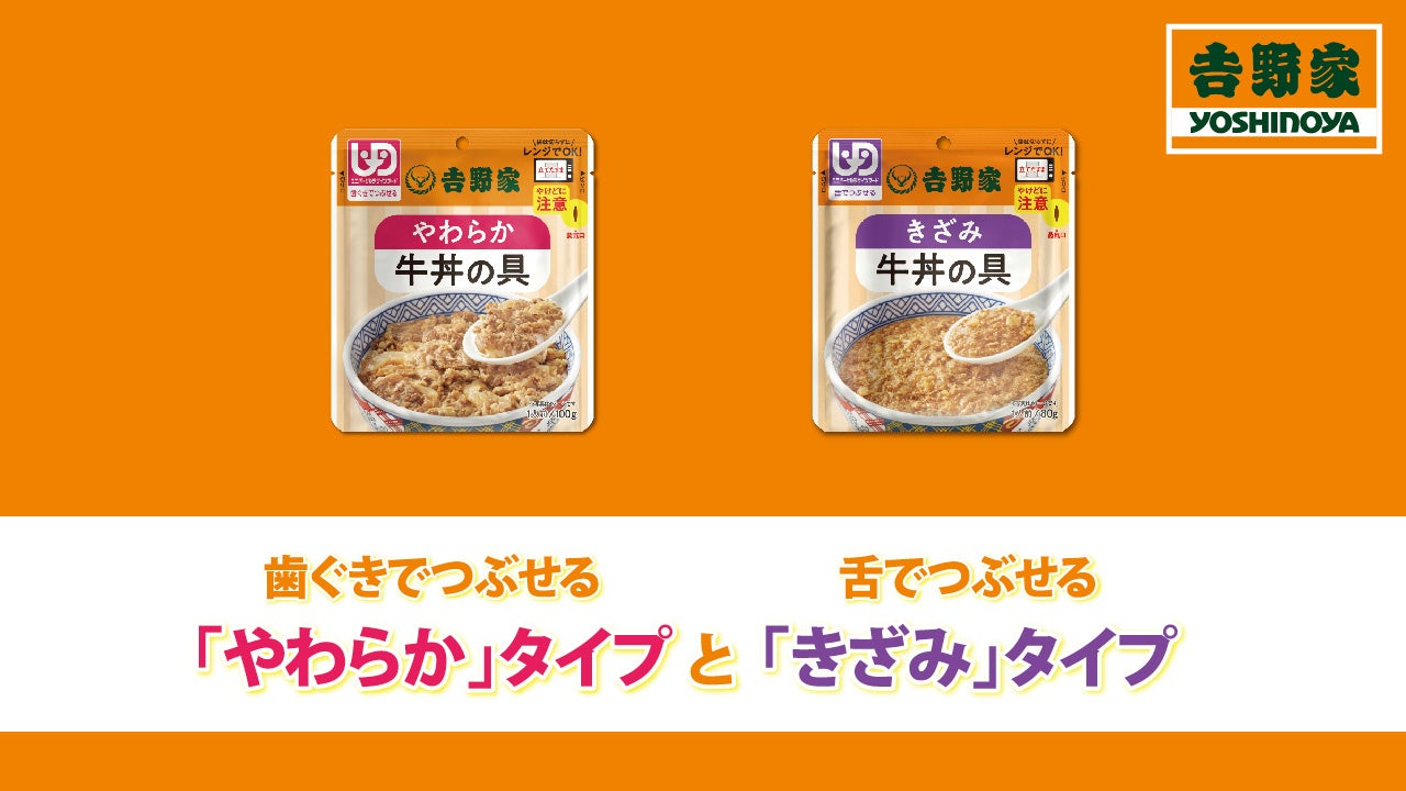 吉野家は主力商品である「牛丼」は誰もがお楽しみいただけるよう、時代や社会構造の変化と共に変わりゆくお客様の暮らしに応じて提供方法を拡大し続けています。現在、全国にある1,202店舗(2023年4月末時点)で出来立ての「牛丼」を店内飲食、テイクアウト、ドライブスルー、各種デリバリーサービスで提供しています。また、1993年に生活協同組合コープこうべと共同で「冷凍牛丼の具」を販売開始以降、30年以上にわたって生協や通販サイト、宅配事業サービス、総合スーパーなど販路を拡大しながら、広く皆様にご愛顧いただいています。「やわらか牛丼」はご高齢の方に限らず、様々な理由で摂食嚥下機能が低下した方や塩分制限をされている方が、楽しく、美味しくお召し上がりいただける牛丼の具をご提供したいという思いから開発しました。牛肉は筋の少ない部位を使用し、適度にトロミを加え、食べやすくなっています。