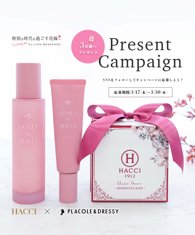 「特別な時代を過ごす花嫁へ」 HACCI と PLACOLE & DRESSYのコラボ企画!花嫁に大人気『ハニーコラーゲンとHONEY BY HACCI 』を3名様にプレゼント!