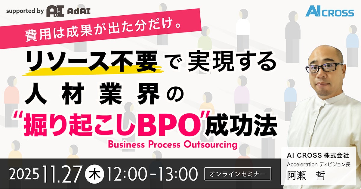 AI CROSS株式会社(本社:東京都港区、代表取締役CEO:原田 典子、以下「AI CROSS」)は、当社主催の無料オンラインセミナー「費用は成果が出た分だけ。 リソース不要で実現する人材業界の“掘り起こしBPO”成功法」を2025年11月27日(木)12時より開催します。