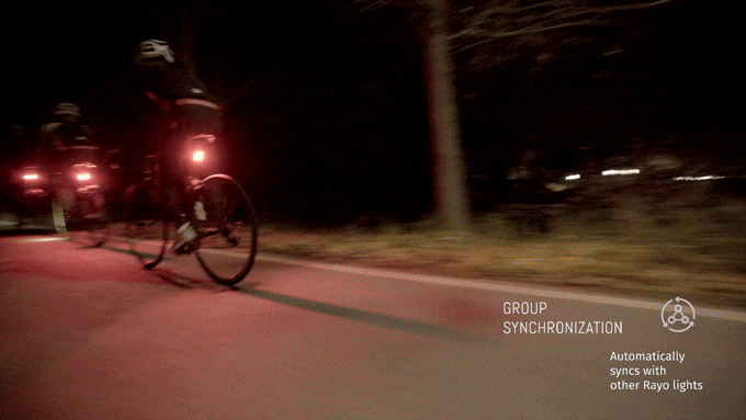 唯一無二とも言えるラヨの機能はLEDライトのシンクロです。ラヨは同行しているほかのラヨと点滅パターンをシンクロさせることが可能で、グループライドではよりグループとして目立つことが可能です。シンクロは複雑なペアリンクなしでも動作します。