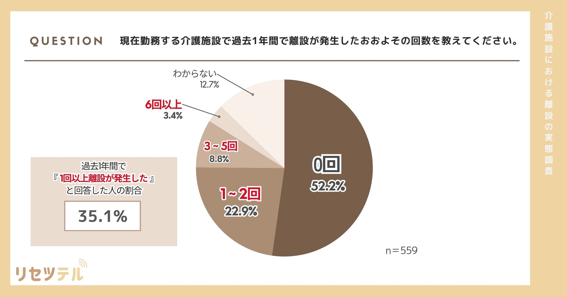 その結果、35.1%が「1回以上離設が発生した」と回答し、約3分の1の施設で離設が発生していることがわかりました。