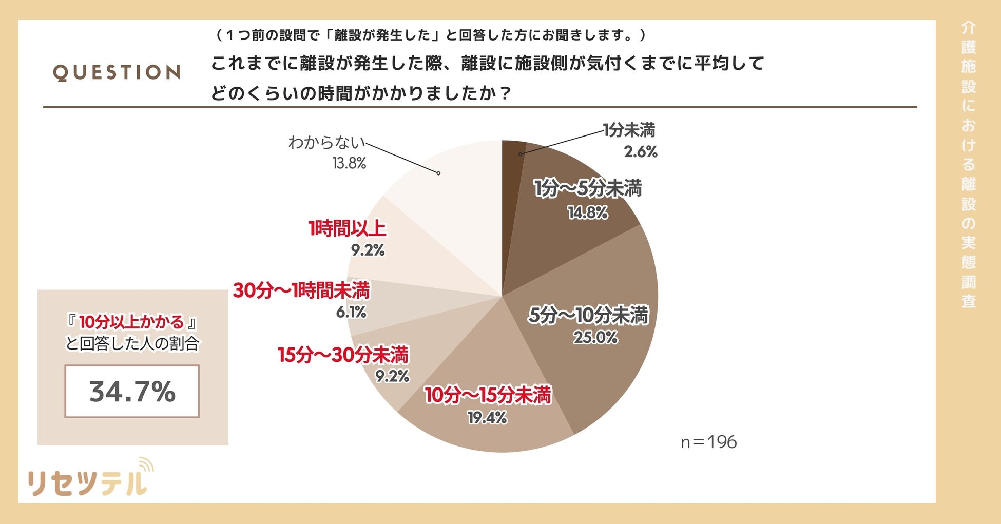 次に、実際に離設が発生した196名に対して、施設側が離設に気付くまでにかかった時間を尋ねました。