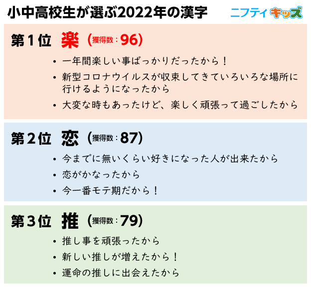 【調査結果】小中高校生が選ぶ2022年の漢字1位は「楽」、2位は「恋」~「ニフティキッズ」にて『小中高校生が選ぶ2022年の漢字』を発表~