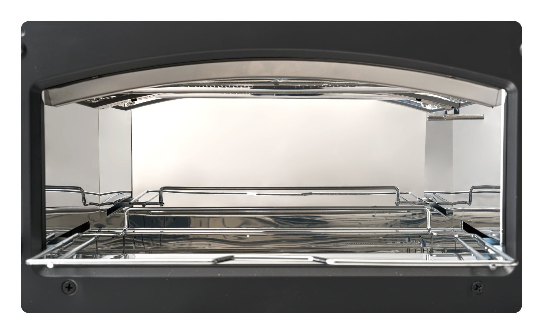 新製品では、オーブンレンジ「石窯ドーム」で培った知見を活かして庫内を3Dドーム構造としました。加えて、熱を高反射する庫内アルミ鏡面仕上げと、0.2秒で発熱する上下グラファイト式ハイスペックヒーターを採用することで、食材に効率よく熱を伝え、ムラなくスピーディーに焼き上げます。