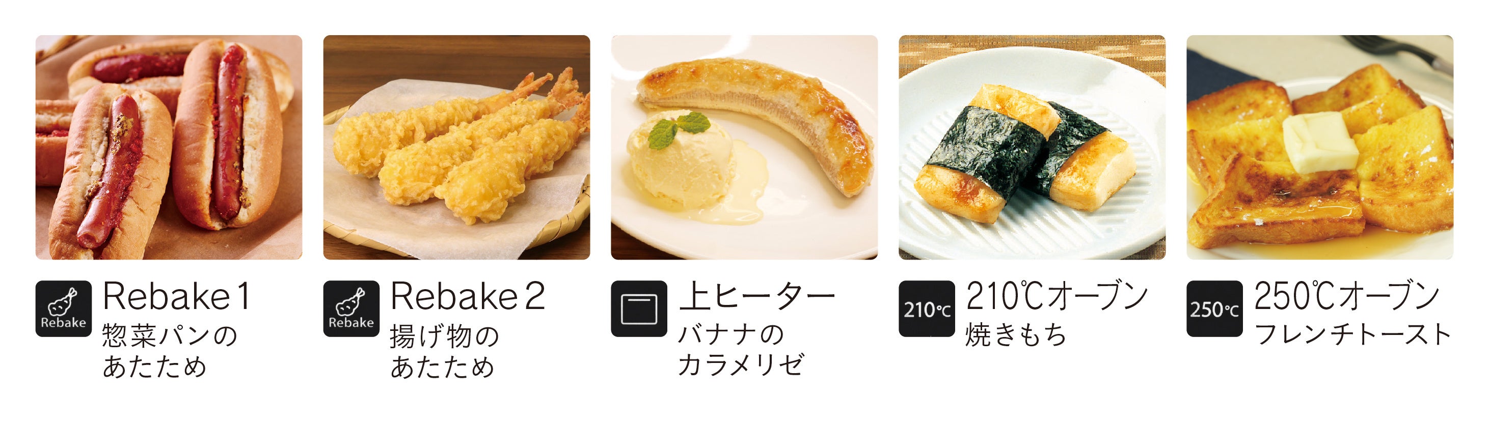 2.ワンタッチで焼き上げる4つの自動メニューと惣菜パンや揚げ物などをあたためるリベイクメニューを搭載