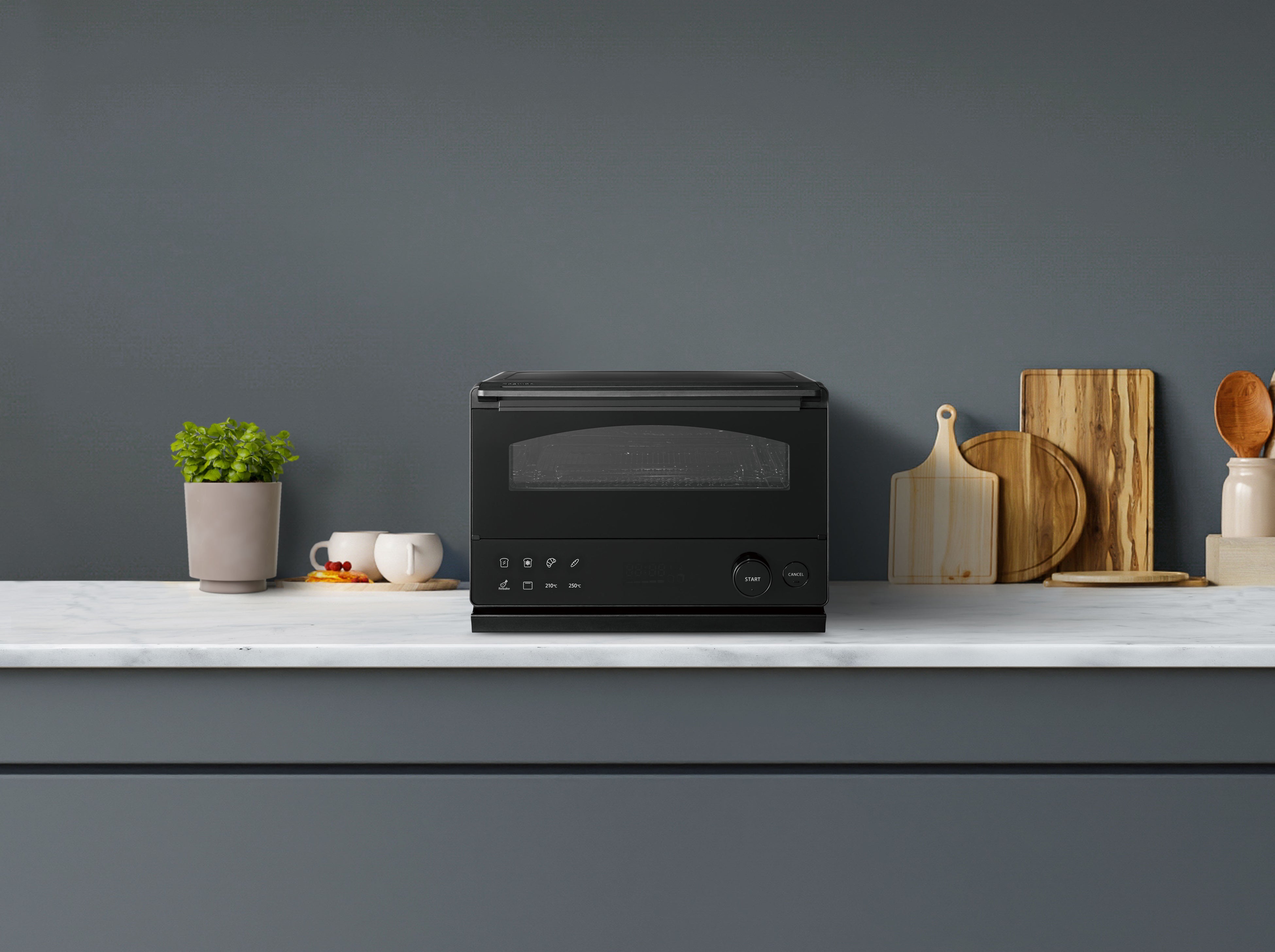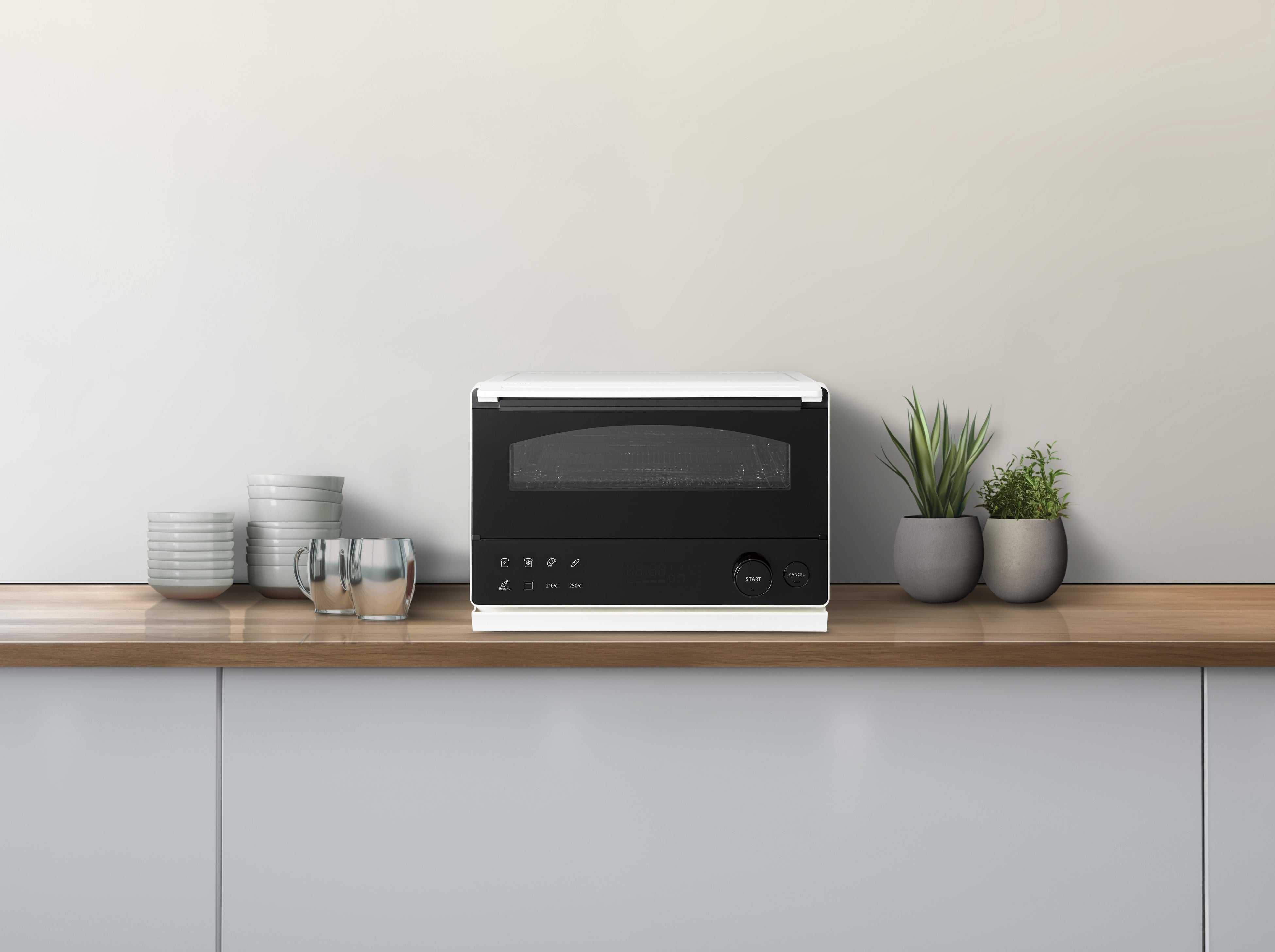 製品形状はシンプルなノイズレスデザインを採用。待機モード時には、主張を抑えたシンプルな佇まいでインテリアに自然と溶け込み空間と調和します。一方使用時には、操作パネルのアイコンが明るく点灯。食材を焼き始めると庫内も明るくなり、ドームのシルエットが強調され、待機モード時とは違った印象となります。