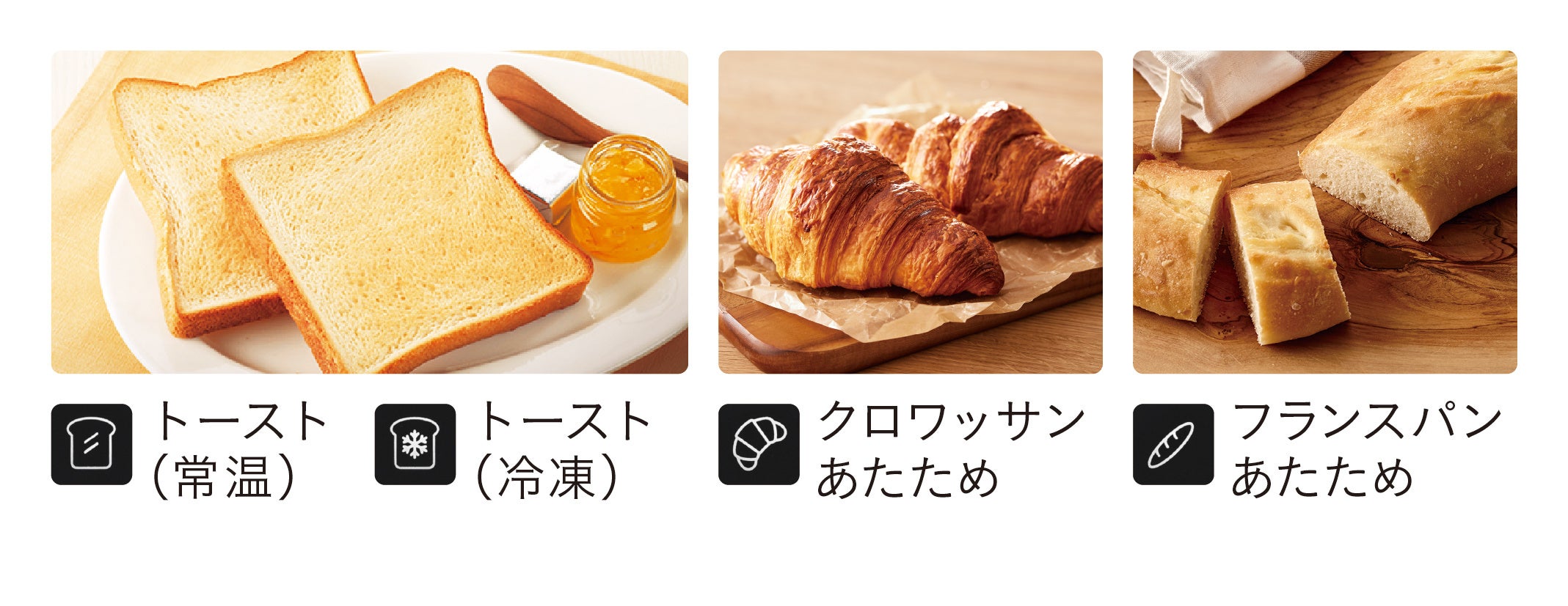 また、トースト(常温・冷凍)、クロワッサン、フランスパンの4つの自動メニューを搭載。温度や時間の設定をしなくても、メニューを選びスタートボタンを押すだけで、焦がさず上手に焼き上げます。さらにリベイクメニューも搭載し、惣菜パンや揚げ物などをできたてのおいしさに仕上げます。