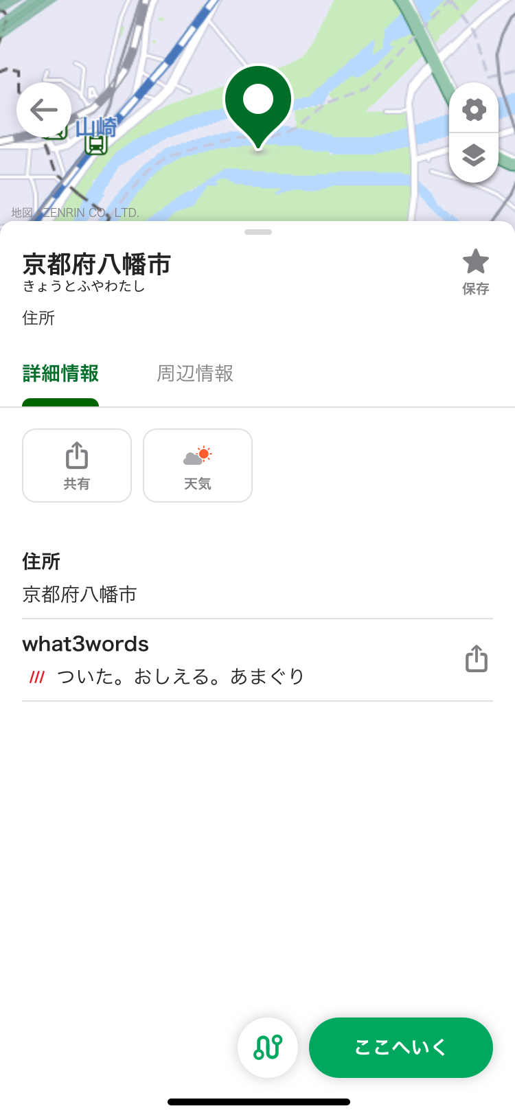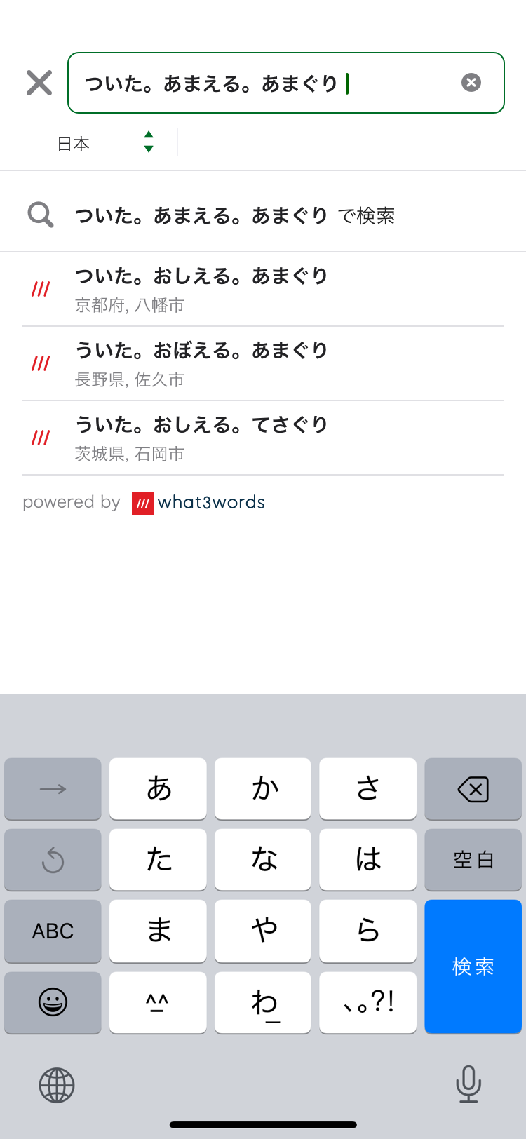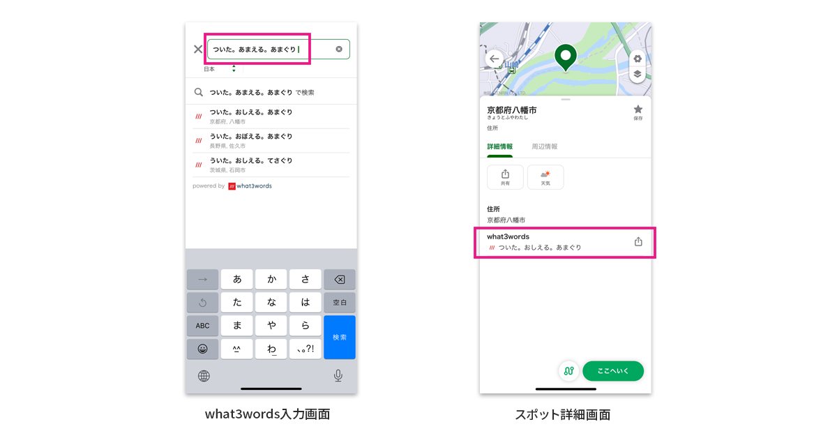 『NAVITIME』では、スポットのフリーワード検索と、ルート検索時の出発地/目的地入力、地図を長押ししたときに表示されるスポット詳細で「what3words」に対応します。