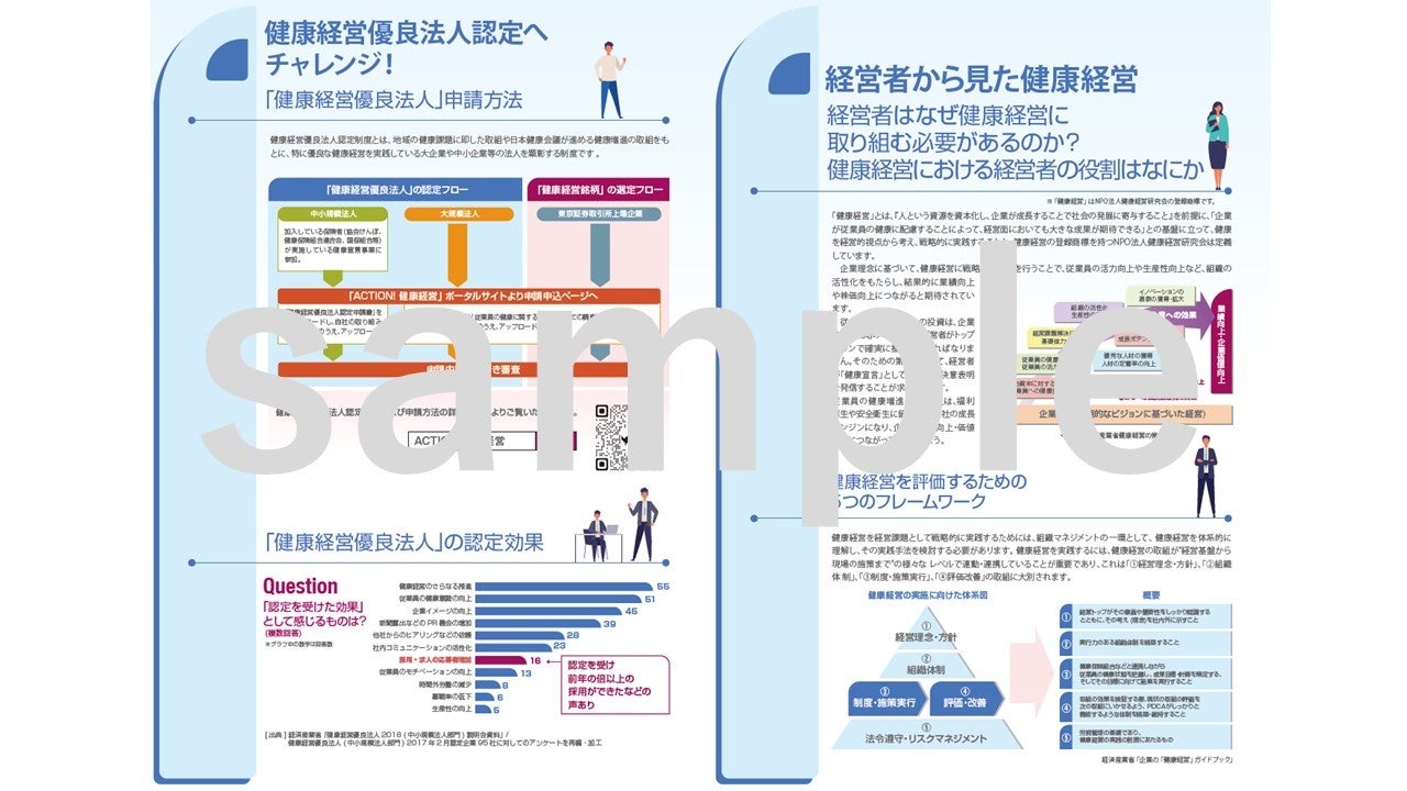 自治体等の皆様が、これから健康経営に取り組む中小企業に向けて、積極的な支援・啓発ツールとして活用しやすいような内容となっています。健康経営を実践するにあたり、求められる経営者の視点や、取り組むステップなどをご紹介しています。
