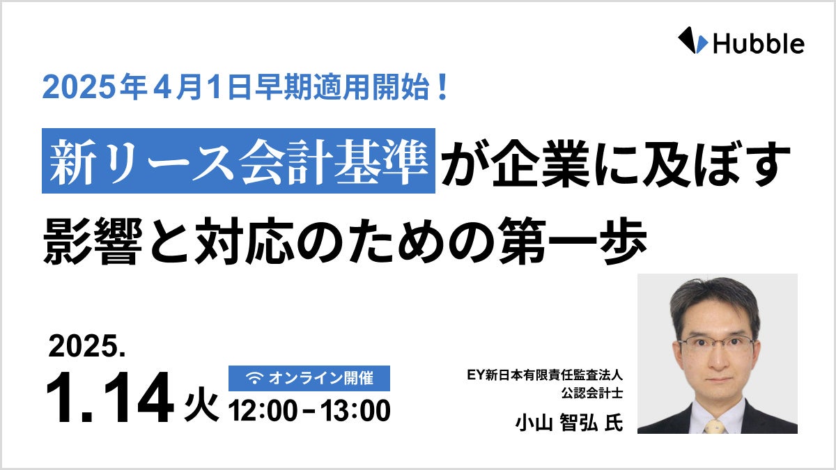 法務と事業部門の協業性を高める契約業務・管理クラウドサービス「Hubble(ハブル)」を提供する株式会社Hubble(東京都渋谷区、CEO:早川晋平)は、2025年1月14日(火) 12:00-13:00にて、EY新日本有限責任監査法人 小山 智弘 氏をお招きし、「2025年4月1日早期適用開始!新リース会計基準が企業に及ぼす影響と対応のための第一歩」と題したウェビナーを開催いたします。本ウェビナーはZoomでのオンライン配信・事前登録制です。
