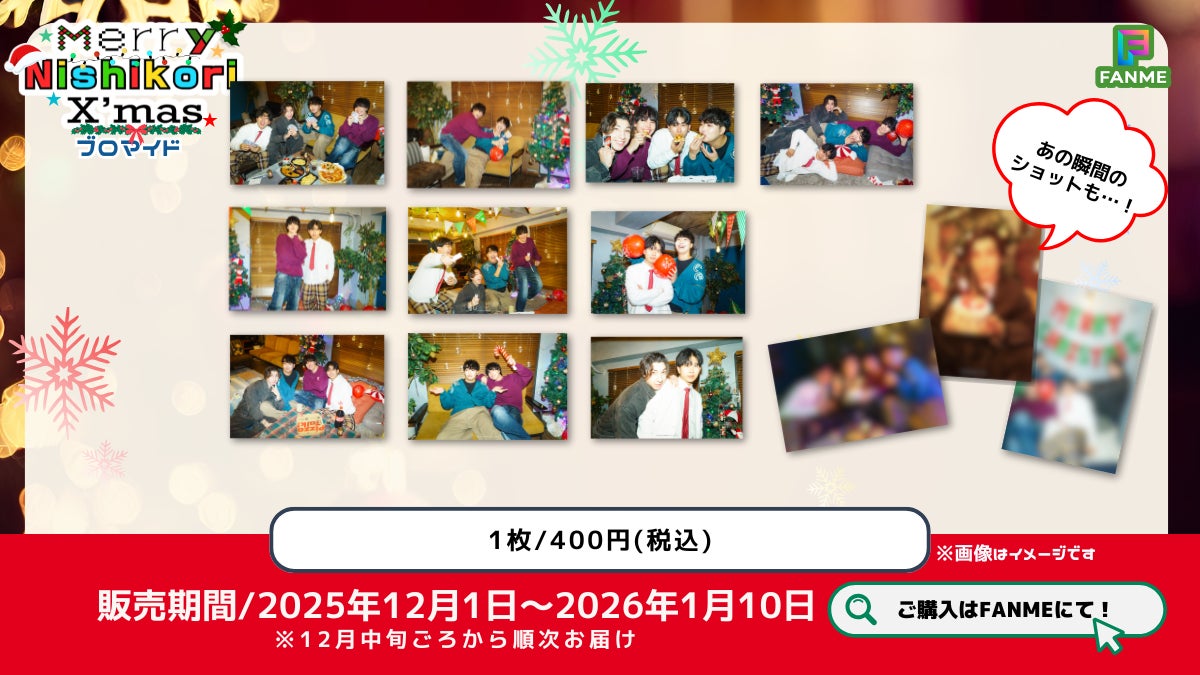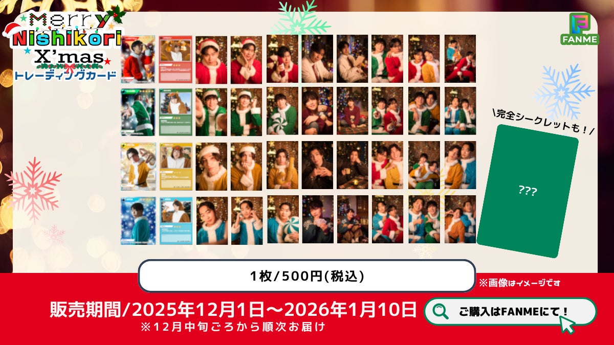 クリエイターDXカンパニーである株式会社TORIHADA(本社:東京都渋谷区、代表取締役社長:若井 映亮)が開発・運営するクリエイターコンテンツ販売サービス「FANME(ファンミー)」は、人気クリエイターグループ「ニシコリ」のクリスマスシーズン限定新作グッズコレクションを、12月1日(月)よりFANMEにて販売いたします。この冬だけの特別なグッズで「ニシコリ」の新たな魅力をお届けします。