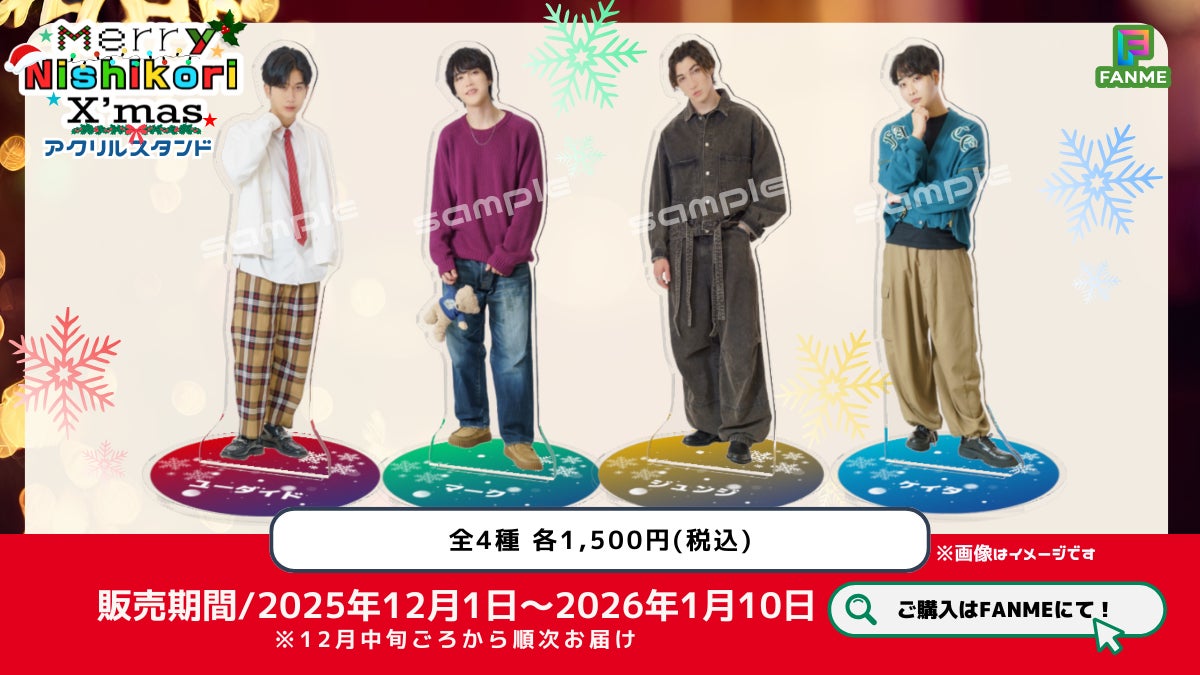 今回のグッズは、”ニシコリと過ごすクリスマス”をテーマに様々なアイテムをご用意いたしました。アクリルスタンドやランダムブロマイドなど、全5種類のアイテムがラインナップ。ここでしか手に入らない特別なグッズで、ニシコリのメンバーたちとこの冬を楽しみましょう!